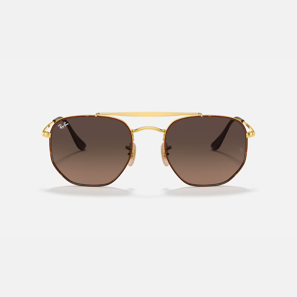 The RAY BAN 3648, 54, 9104, 43 sunglasses are a men's model with a full-rim frame made of metal. The frame is a dark brown color with gold accents. The lenses are brown gradient, which means they are darker at the top and lighter at the bottom. The sunglasses have a standard size of 54 millimeters across the lenses and 21 millimeters across the bridge. The temples are 145 millimeters long. The sunglasses are available from a variety of retailers, including